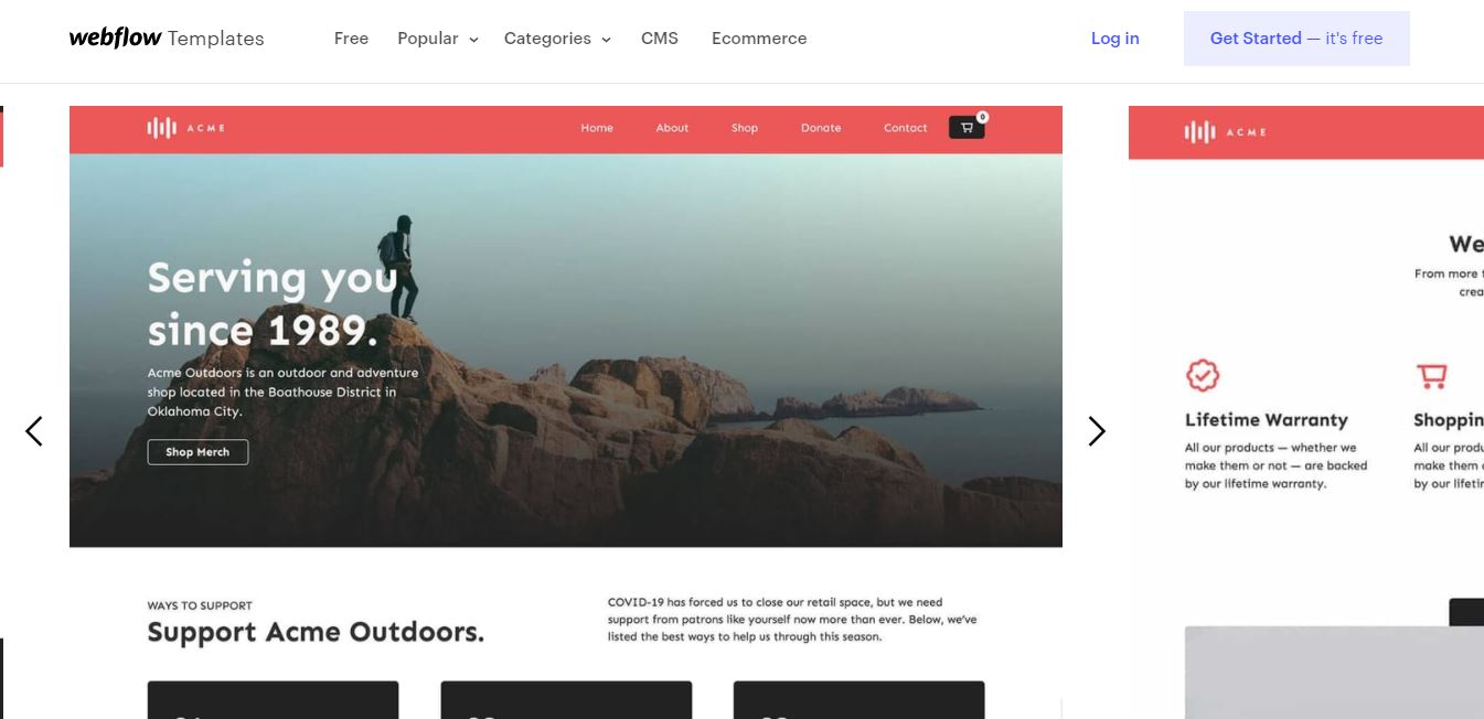 Everything on Webflow is very well-organized. For example, if you’re looking at templates and want something for a photography portfolio, all you need to do is select free templates and then start searching by category, the style you want, or by features. Tons of examples will show up for you to look through. The organization and free easy access makes finding a template quick and easy.